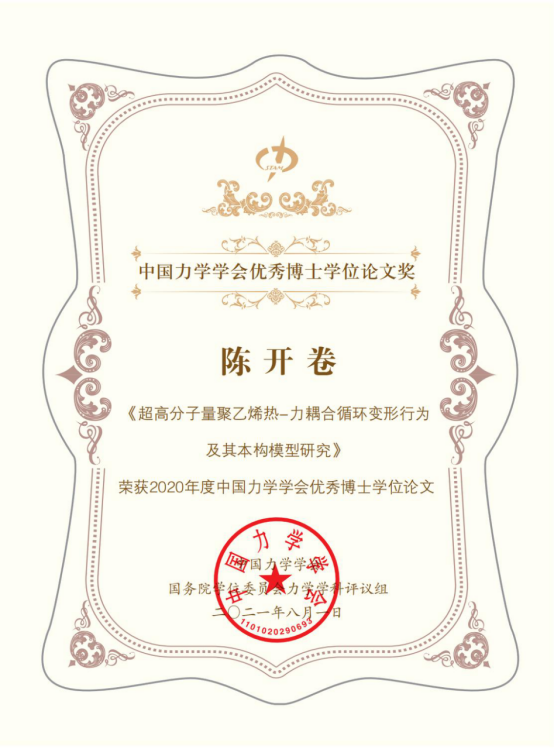 第五届(2020年度)中国力学学会优秀博士学位论文评审于7月16日完成,评选对象为2018年9月1日至2020年8月31日期间在中国获得力学学科相关专业博士学位获得者的学位论文。根据《中国力学学会优秀博士学位论文评选条例》,通过单位或理事推荐、同行专家初评、候选论文公示、评审委员会复评等程序,共有5篇论文入选优秀博士学位论文、5篇获优秀博士学位论文提名。力学学院康国政教授指导的博士毕业生陈开卷的论文《超高分子量聚乙烯热-力耦合循环变形行为及其本构模型研究》获此殊荣,入选中国力学学会优秀博士论文。