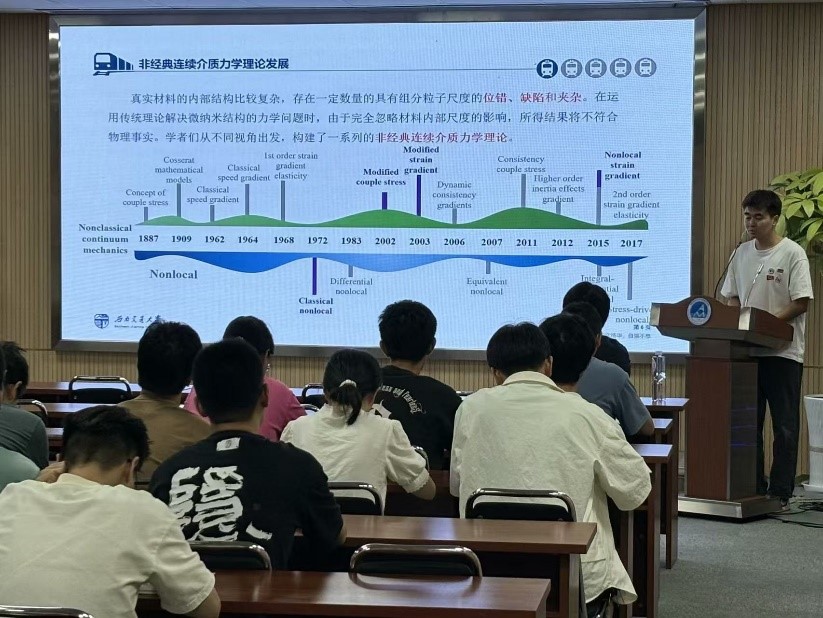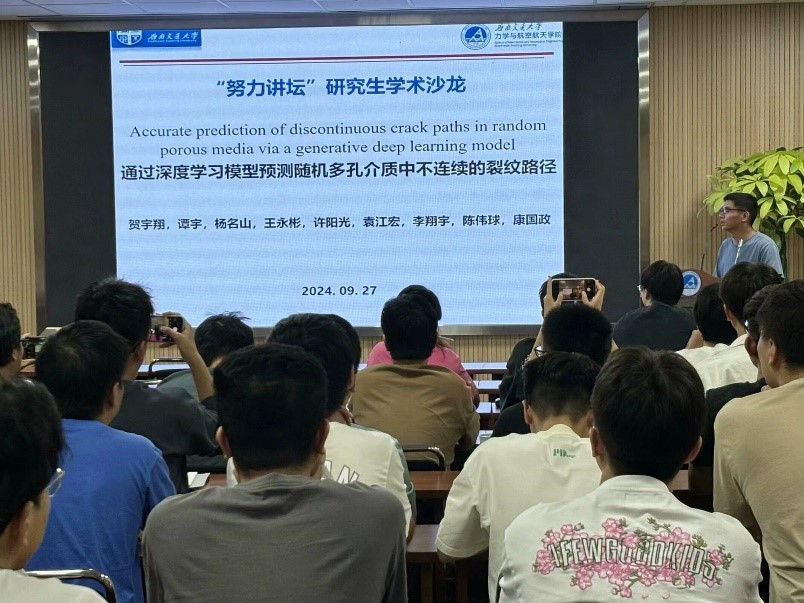 会中,贺宇翔同学为同学们介绍了多孔介质在各个领域的应用。随后他又讲解了自己的研究方法,深度学习模型可以基于图像在几秒内预测裂纹路径,并且不需要任何的力学计算,准确率超过90%。邓涛同学讲述了微观尺度计算力学理论的研究背景以及非经典连续介质力学理论的发展,又介绍了自己选择现在研究方向的原因,以及从自己从入学到发表论文之间的科研历程,对在场的同学们提出一些针对性建议。会后,两位同学都耐心解答同学们各自想要了解的问题,与同学们进行了详细的回答。
