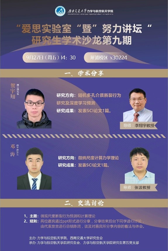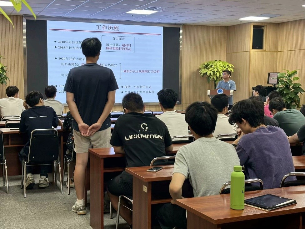 在本次活动中,贺宇翔以“微观尺度断裂行为预测”为题,主要从研究背景、研究方法、学习生活等方面进行分享。邓涛以“微观尺度计算力学理论”为题,主要从研究背景、理论发展、科研的选择、历程与建议等方面来分享。