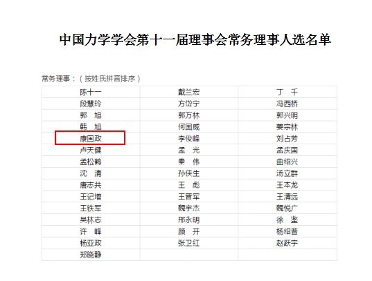 会议投票选举产生了中国力学学会第十一届理事会常务理事、副理事长、理事长,第十一届理事会全体理事通过了第十一届理事会秘书长的聘任人选。我院院长康国政教授当选中国力学学会第十一届理事会常务理事,是自我院孙训方教授1982年当选中国力学学会副理事长、常务理事以来我院第2位、我校第3位当选常务理事的老师。