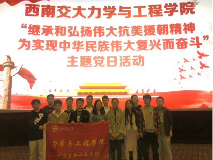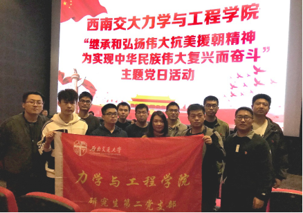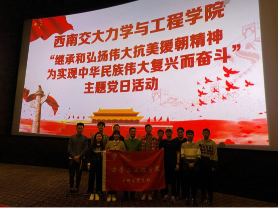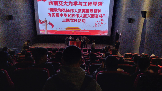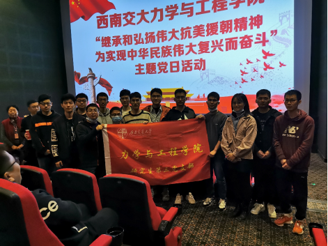学生党支部在学院党委的组织下,于2020年10月30日下午14点开展了“继承和弘扬伟大抗美援朝精神,为实现中华民族伟大复兴而奋斗”的主题党日活动,全体党员集体观看了国家电影局为纪念抗美援朝70周年的重点影片《金刚川》。