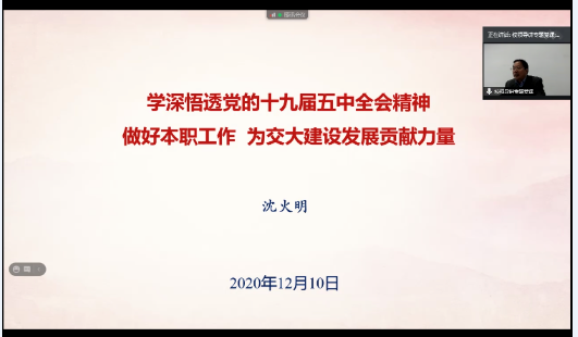 全体教职工党支部和学工组通过腾讯会议线上形式,集体听取了校党委副书记沈火明教授题为《学深悟透党的十九届五中全会精神,做好本职工作,为交大建设发展贡献力量》的专题党课,