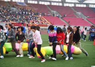人,分别站在起点与终点,五人一组骑在一条彩色的巨大玩具毛毛虫上,步调一致的向前走;一个来回后先回起点的队伍获胜。比赛时大家气氛热烈,热情高涨,响亮的口号和一致的步伐成为一道靓丽的风景!如果说骑毛毛虫靠的是默契和团结,获得是笑声和掌声,那么