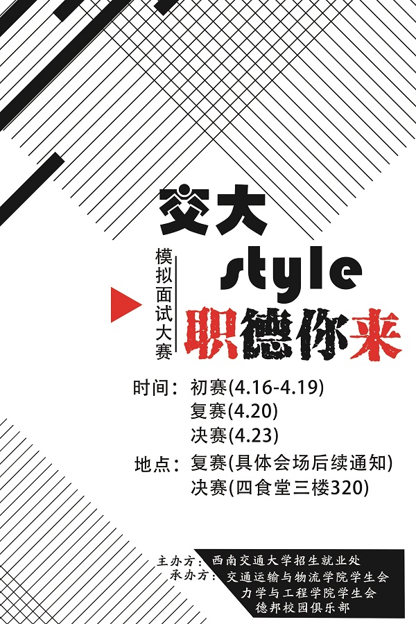 学生会、交通运输与物流学院学生会以及西南交通大学德邦俱乐部承办的“交大style“职”“德”你来模拟面试大赛即将举办。