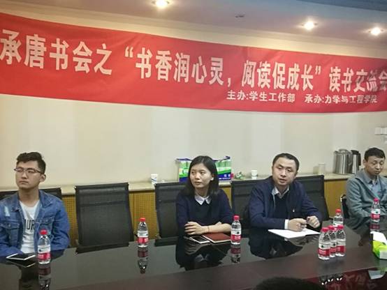 承办的承唐书会之“书香润心灵,阅读促成长”读书交流会,在九里校区1号综合楼会议室顺利举行。此次活动由郭春燕同学和郑双星同学主持,并邀请了产业处综合管理科副科长周永生老师以及院团委副书记、研究生辅导员张英蓉老师担任嘉宾。