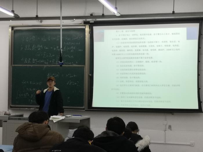 本次主题班会围绕以下内容展开:一、辅导员胡持老师带领全体同学一起学习了《西南交通大学本科生考试违规处理办法》(西交校教[2018]29号)全部内容和《西南交通大学学生纪律处分规定(试行)》,告诫同学们不能触碰纪律红线,无论考试、学习还是做人,诚实守信是十分重要的品质。如果考试期间不诚实,不仅会受到纪律处分,同时对别的同学来说不公平,更重要的是损害了个人品质,也达不到考试本来的目的,可谓百害而无一利;第二,杨老师围绕防火防盗防骗防踩踏、宿舍安全、人身安全以及财产安全等安全问题进行强化教育。提醒同学们即将到来的元旦假期尽量不要到人多的地方凑热闹,多利用假期加强复习;冬季天气寒冷,但坚决不能再宿舍使用违章电器,威胁大家的人身安全;妥善管理自己的财物,注意防骗防盗,尤其不能碰网络借贷;注意出行安全,及时防范、远离危险等。
