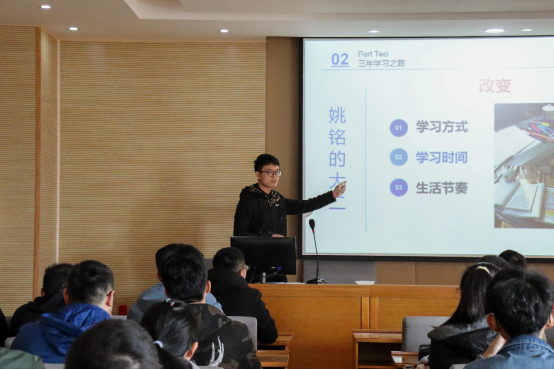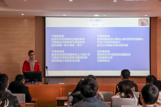 接下来,来自地球科学与环境学院的钱彬祥学长,以一首《不敢回宿舍》的小诗惊艳四座,然后深入透彻的分享了他对于班干部与普通同学的关系的一些想法以及开展班干部工作的一些方法。