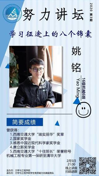 202025日晚900,努力讲坛第三期准时开讲。本期讲坛由来自机械学院的姚铭同学担任主讲人,力学学院本科生党支部牛国浩同学担任主持人,讲授主题为学习征途上的八个锦囊