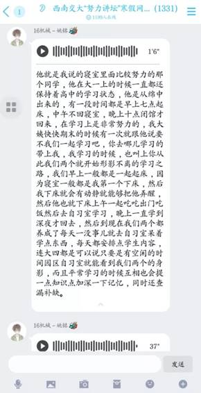 姚铭同学首先介绍了自己名字的来历,再用班级的例子说明良好的学习氛围十分重要。他认为,学习需要用合适恰当的方法。我们在日常学习中要多和同学、老师交流,对知识点反复巩固,善于使用笔记和教辅来解决作业难题。姚铭同学以自己大学三年的求学之路为例子,结合亲身经历从多个角度讲解了他的学习心得。
