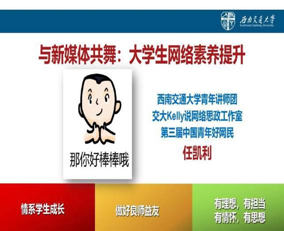 213日晚,学校团委副书记(挂职)任凯利老师为同学们带来网上讲坛,任老师是学校新媒体大咖、交大Kelly说的创始人,本次讲座的主题是与新媒共舞。