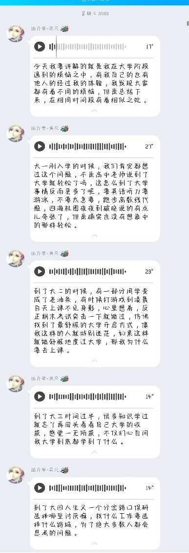 吴凡同学首先分享了他与大多数同龄人一样的烦恼,接着从自身的大学经历出发,向大家讲述了大学学习的四个烦恼,引领大家寻找烦恼背后的答案。