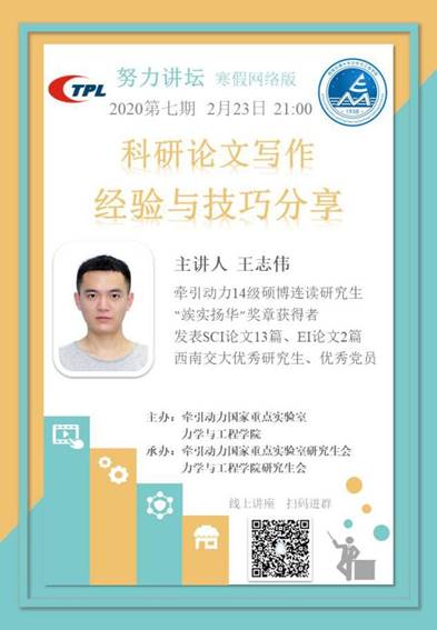 223日晚9:00,努力讲坛第七期准时开讲。本期讲坛由来自牵引动力国家重点实验室的14级硕博连读研究生的王志伟博士担任主讲人,牵引动力的何倩同学担任主持人,讲授主题为科研论文写作经验与技巧分享