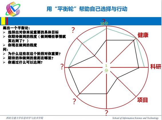最后,马书记为我们引入了一个新的概念:平衡轮理论。即当我们有一个目标时,可以将它划分为几个部分,当这几个部分平衡发展时,轮子才会转动。同样道理,要想实现目标,就需要各个方向平衡发展。马老师还谈到,我们可以利用平衡轮理论来帮助自己选择与行动。首先,我们可以画出一个平衡论:先选择出对你来说重要的具体目标;再明确你期待做到的程度;最后明确你现在做到的程度。然后反问自己:为什么这些目标在这个阶段对你重要?期待和做到的差距在哪里?你通过什么方式可以达成目标?通过这样一问一答,我们就在无形中促进了自己的行动,最后所有的焦虑都将止于“行动”。