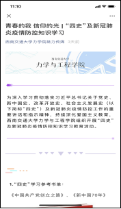 学院高度重视,认真组织,通过学院年级QQ、微信群、公众号推送信息等多种形式,面向学生广泛宣传“四史”及新冠肺炎疫情防控知识,各年级辅导员负责,各班级班长和团支部书记组织,以班级为单位开展大学习,在学院官微和官微“砥力”传媒发布了学习的参考书单、视频等学习资料,号召学生以自学为主开展学习,做到不忘历史、不忘初心、知史爱党、知史爱国。