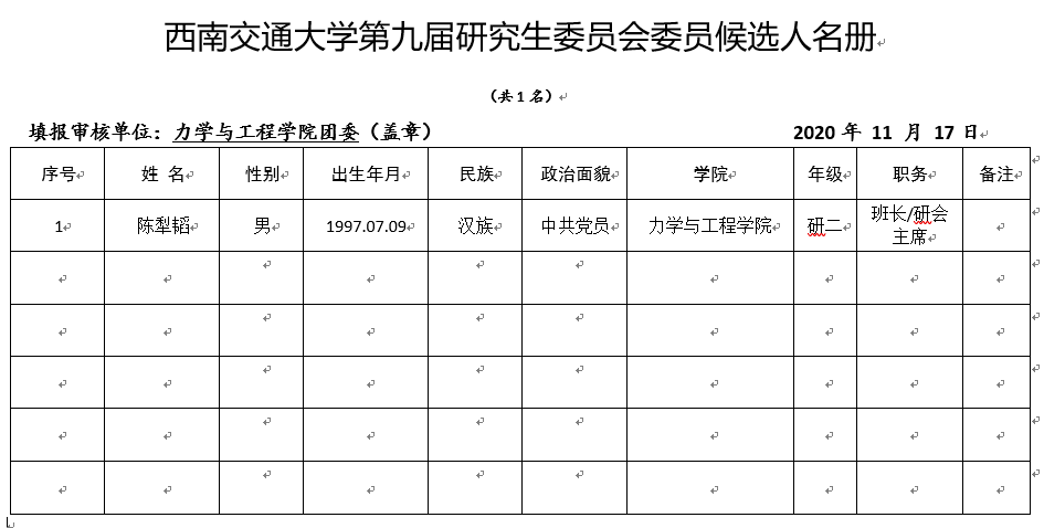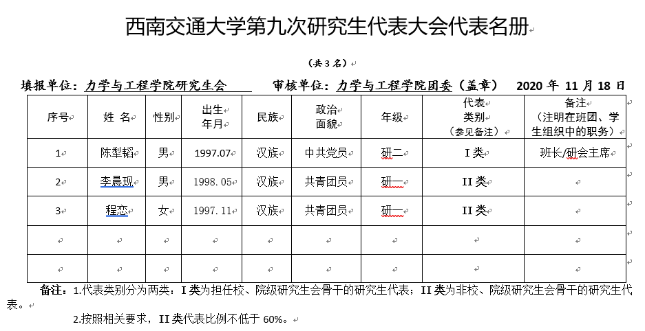 经班级(团支部)和学院研究生会推荐,现将拟推荐参加西南交通大学第九次研究生代表大会的代表名单与委员名单进行公式。如有异议,请于11月20日17:00前向学院团委反映,地点:X2309,电话:66366796。