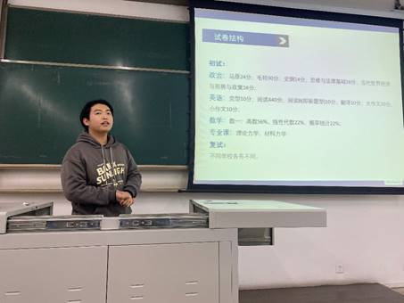 随后,石文翔学长和大家分享了关于考研的注意事项,并且向同学们展示了关于考研的一些相关信息和数据,又向同学们分享了关于考研各科目的复习时间安排和可参考的书籍资料。