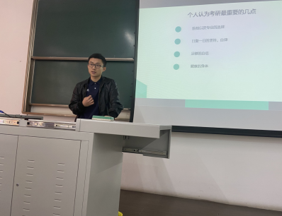 然后,李恒达分享了自己考研本校的历程,他详细介绍了班级同学的去向、自己考研原因、考研院校选择、复习的心得等,让同学们了解考研的准备过程。