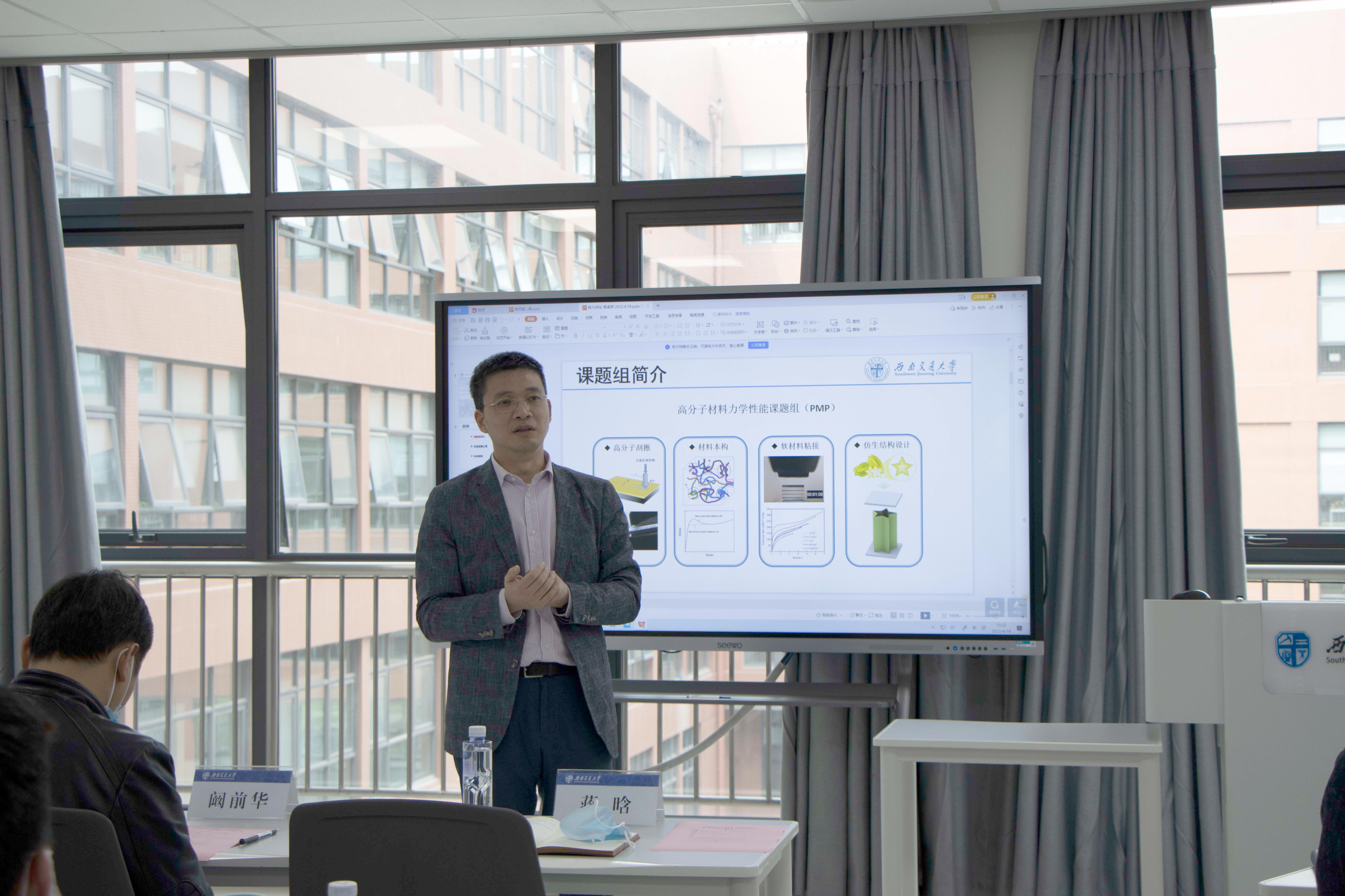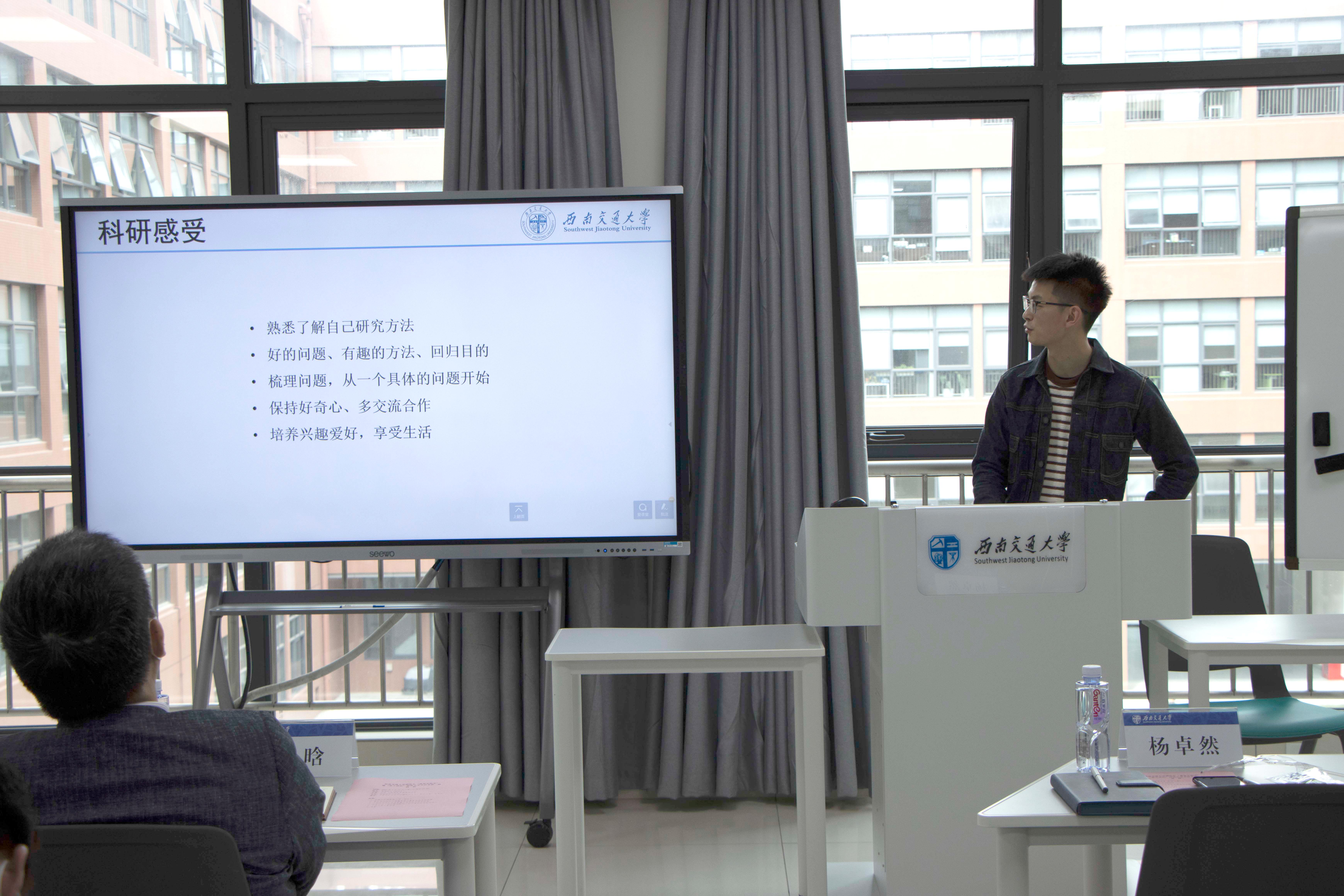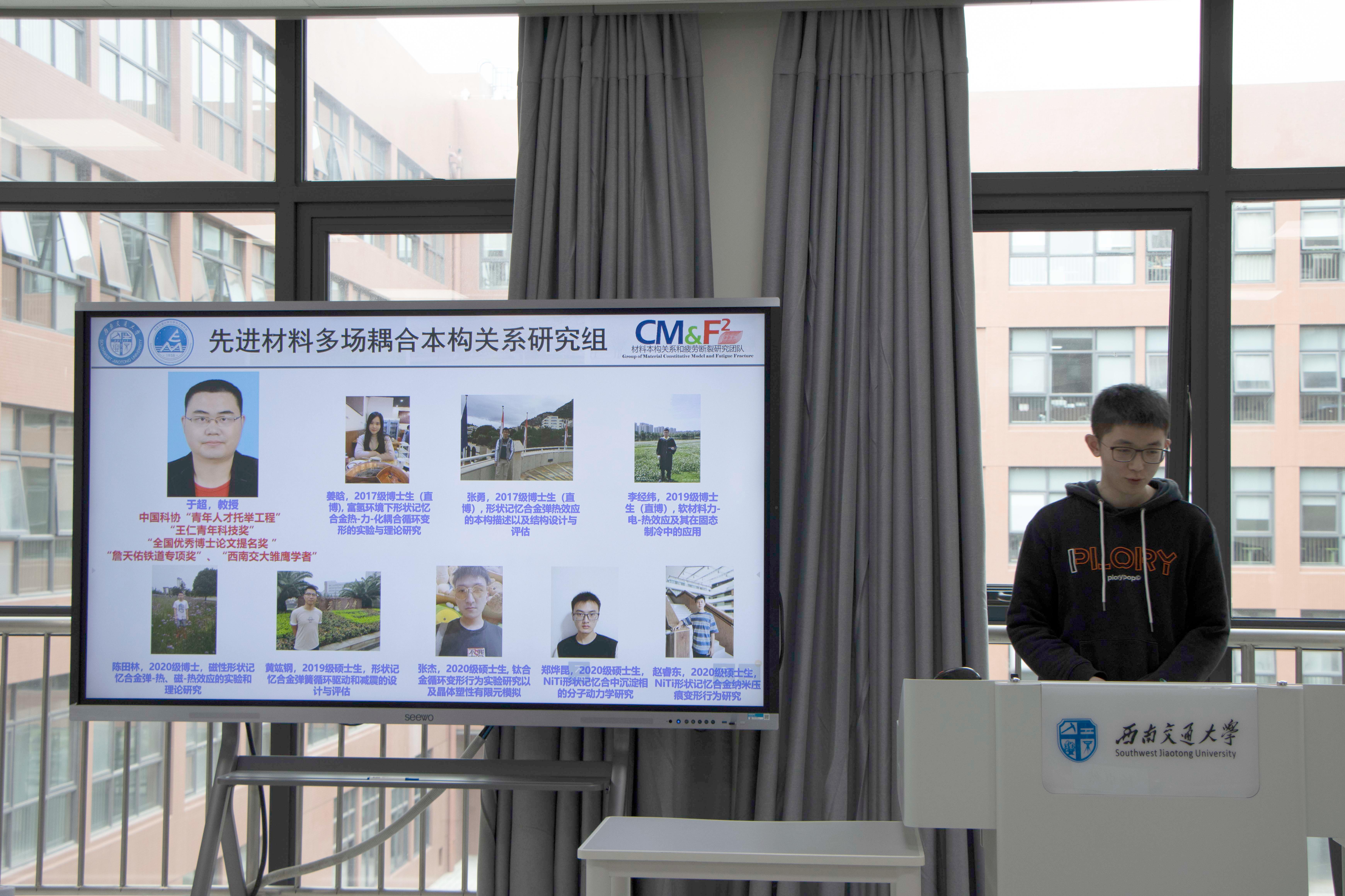 活动第一部分,蒋晗老师团队的杨卓然博士以“我的科研成果”为题,首先对其所在的团队——高分子材料力学性能研究小组进行了简单的介绍,其后详细分享了自己的科研经验和感受,并特别指出:在科研工作中要保持好奇心,处理事情需要有自己的看法和创新。
