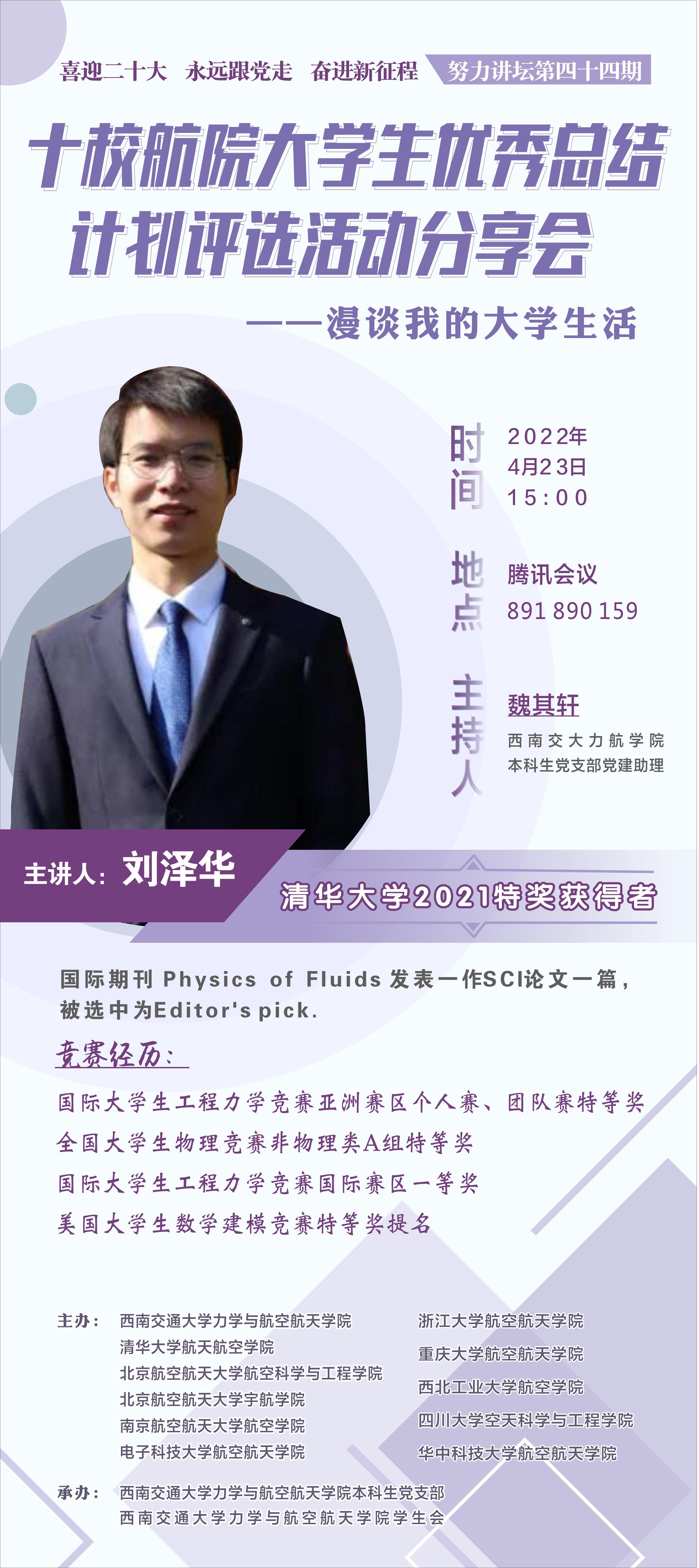 2022年4月23日下午,十校航院大学生优秀总结计划评选活动分享会暨“努力讲坛”第四十四期“漫谈我的大学生活”顺利开展,本次活动由西南交大、清华、北航、南航、浙大、西工大、华科、川大、重大、电子科大十校航院主办,西南交通大学力学与航空航天学院本科生党支部、学生会承办。本次活动以线上分享的方式进行,主讲嘉宾为清华大学航天航空学院2018级本科生、清华大学2021特奖获得者刘泽华,本次活动由西南交通大学本科生党支部党建助理魏其轩同志主持,澳门六合彩开奖记录
