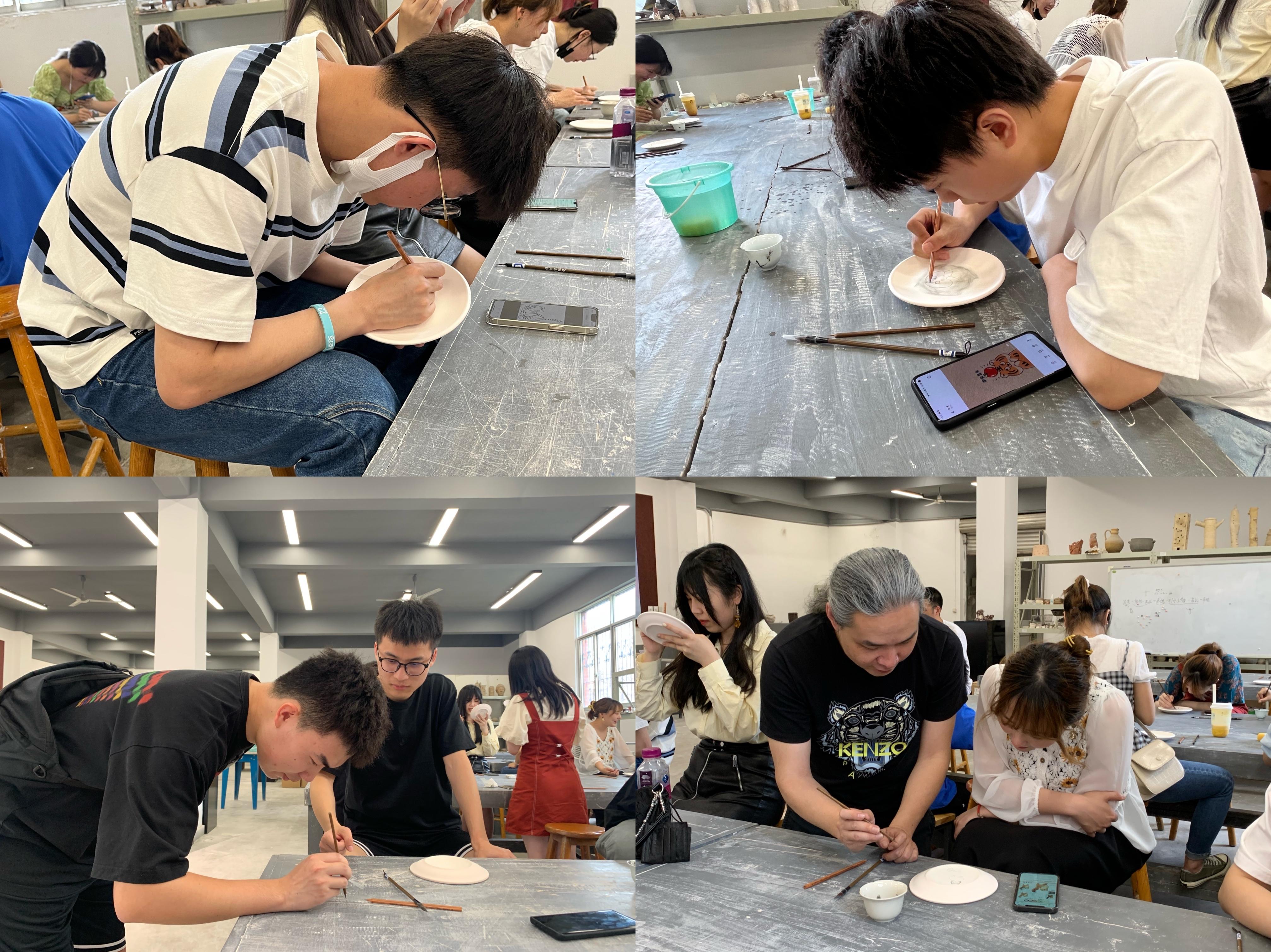 接着,在对陶艺做了初步讲解后,王老师为同学们介绍了本次活动所需的工具及其注意事项,随后,同学们开始陶瓷绘画。在王老师的细心指导下,同学们兴趣盎然,纷纷发挥自己的想象力,专心致志地用毛笔蘸着色料,在陶瓷上一笔一笔地创作着属于自己的陶艺品。活动现场充满着欢声笑语,大家都十分期待能早日拿到经过上釉和烧制后的作品。