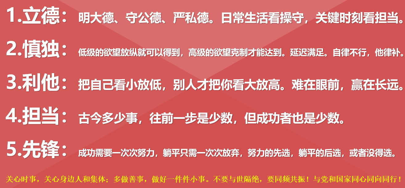 随后,孔祥彬老师引用了习近平总书记近期系列重要讲话内容,并从立德、慎独、利他、担当、先锋五个方面结合鲜活的例子进行讲解,鼓励大家“人生万事须自为,跬步江山即寥廓”,要德智体美劳全面发展,立大志、明大德、成大才、担大任,争做担当民族复兴大任的时代新人。