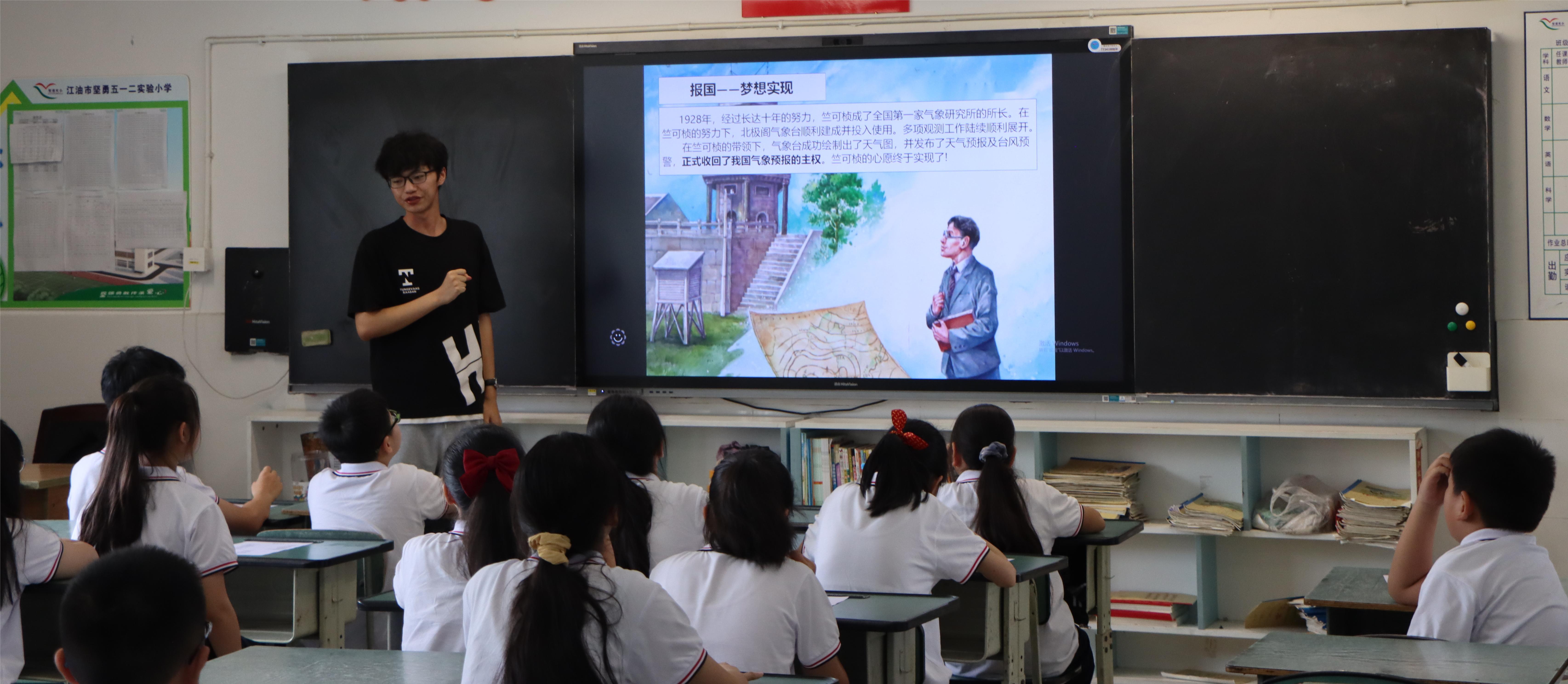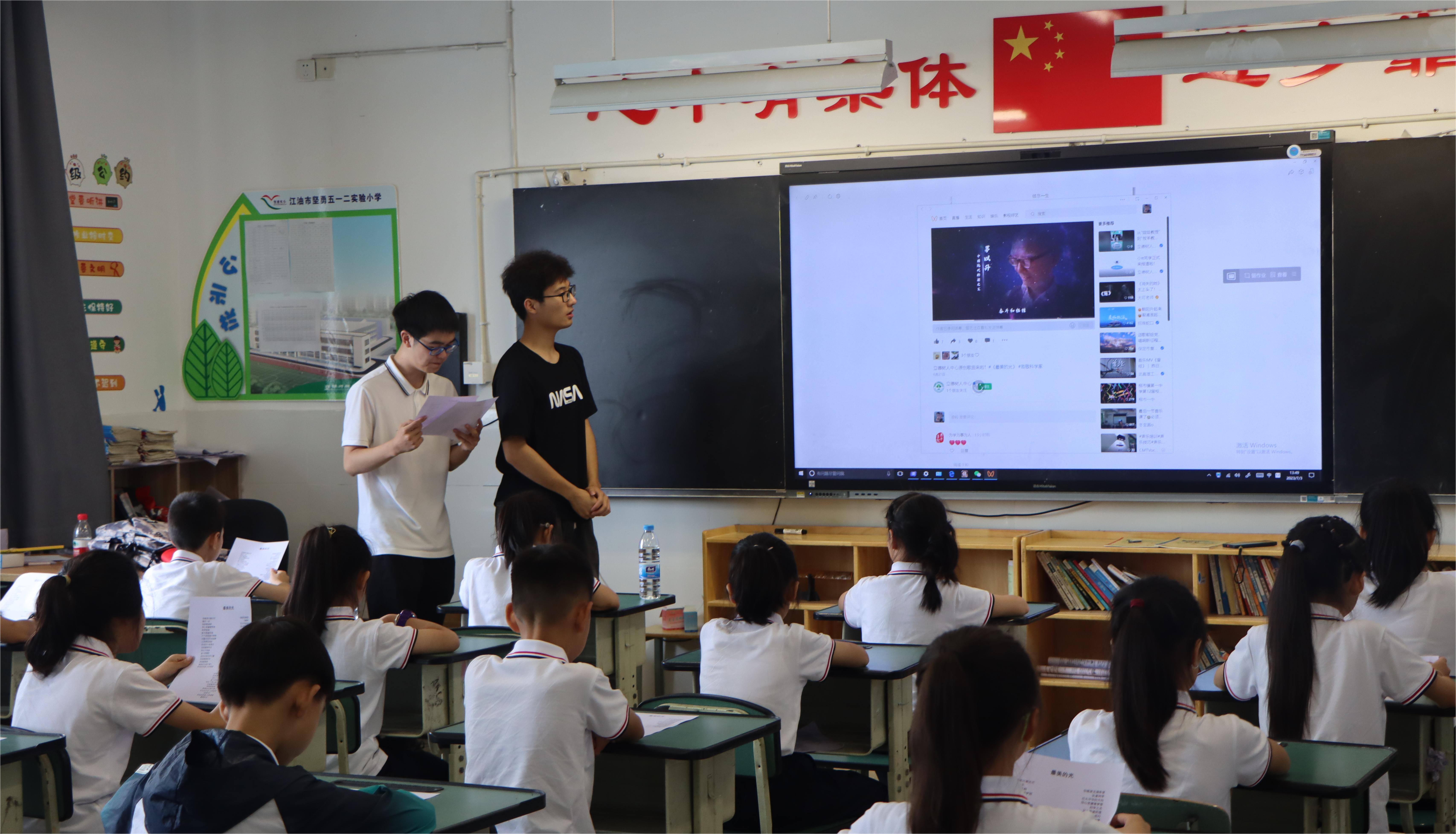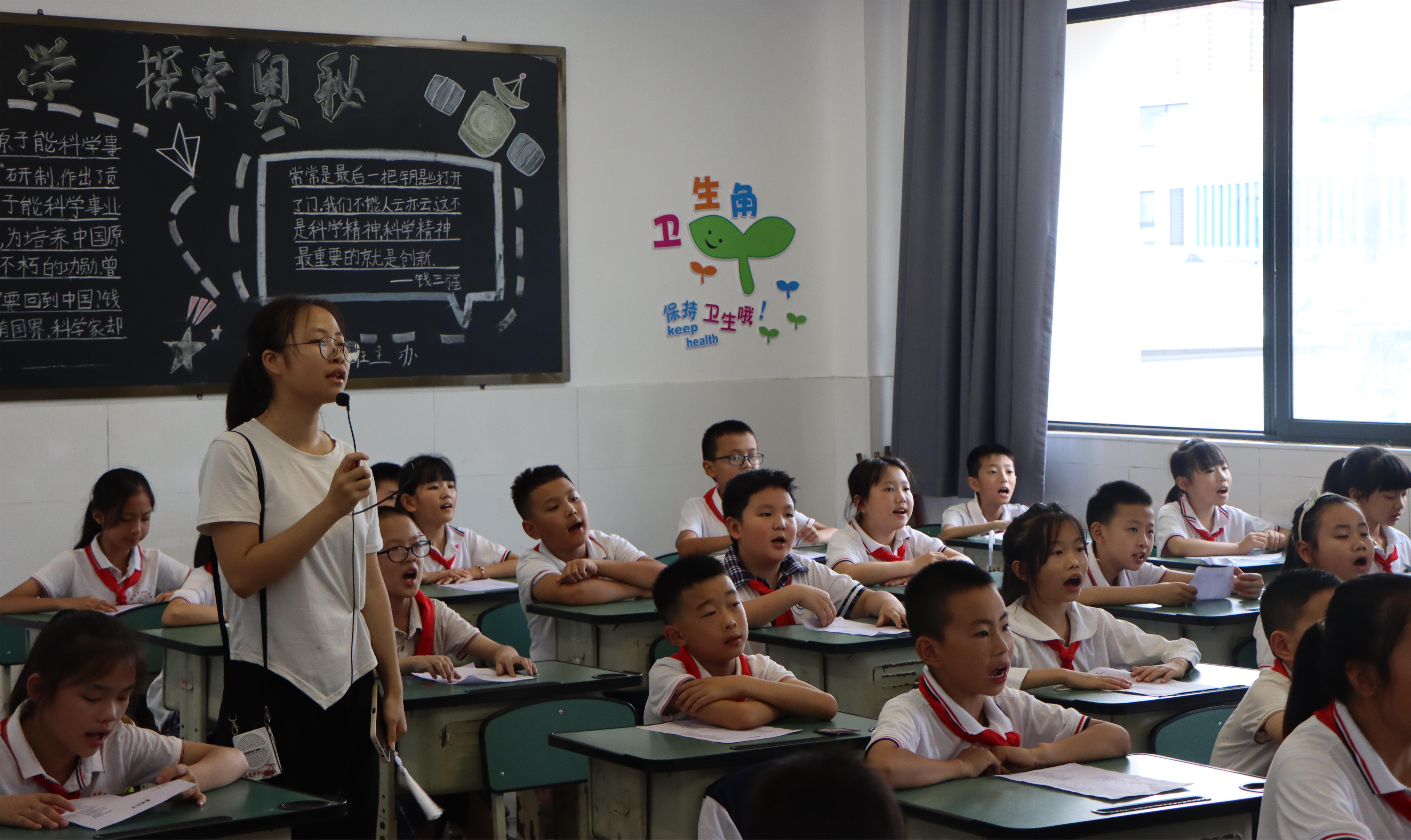 活动开始,实践队成员带领坚勇实小的孩子们学唱歌曲《最美的光》和《中国科学家》,孩子们悦耳的歌声回荡在教室的每个角落。据悉,这两首歌曲均由坚勇实小名誉校长陈永庆先生发起创作,以婉转动听的旋律和朗朗上口的歌词让科学家精神流入听众的心中。
