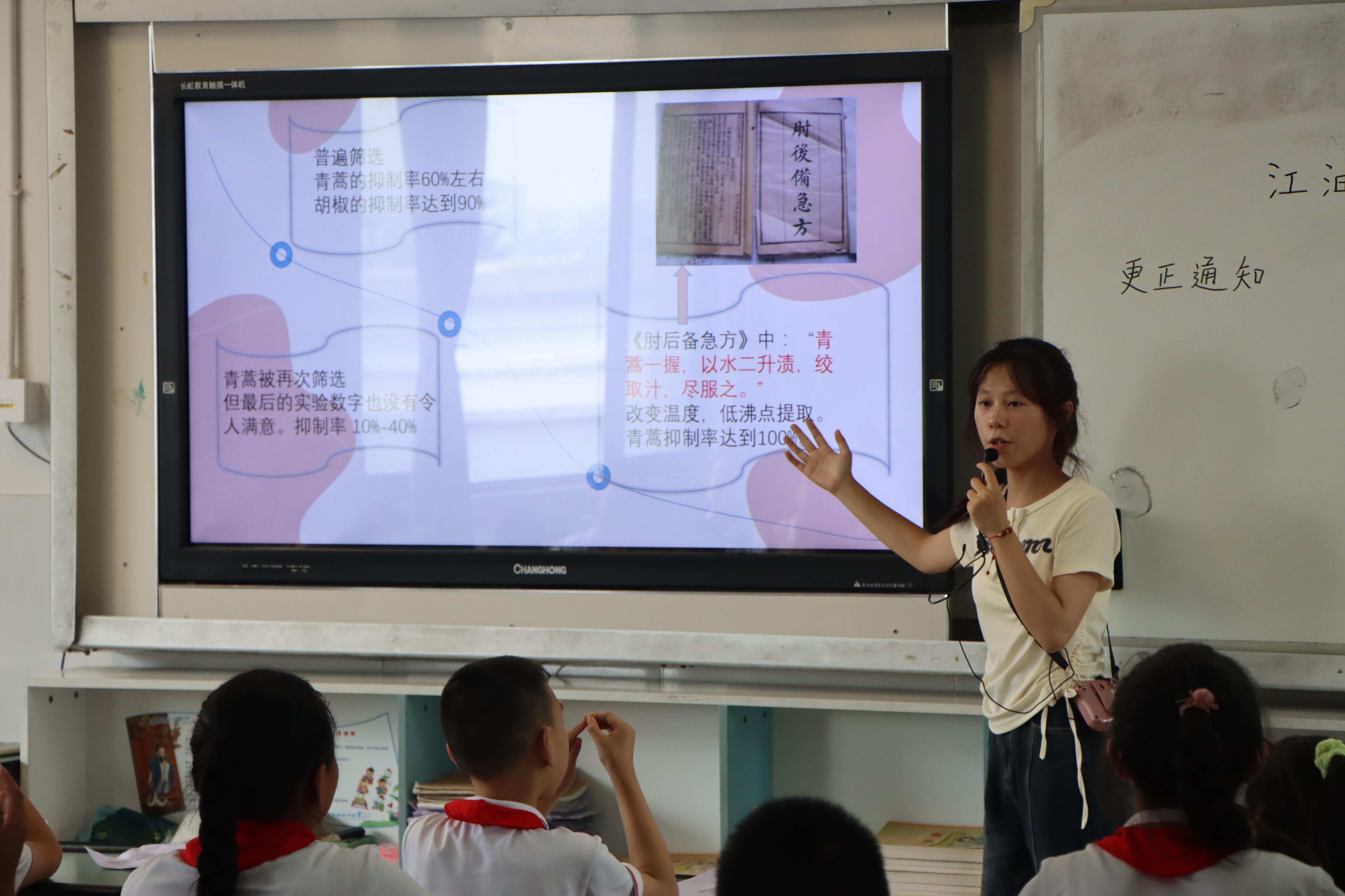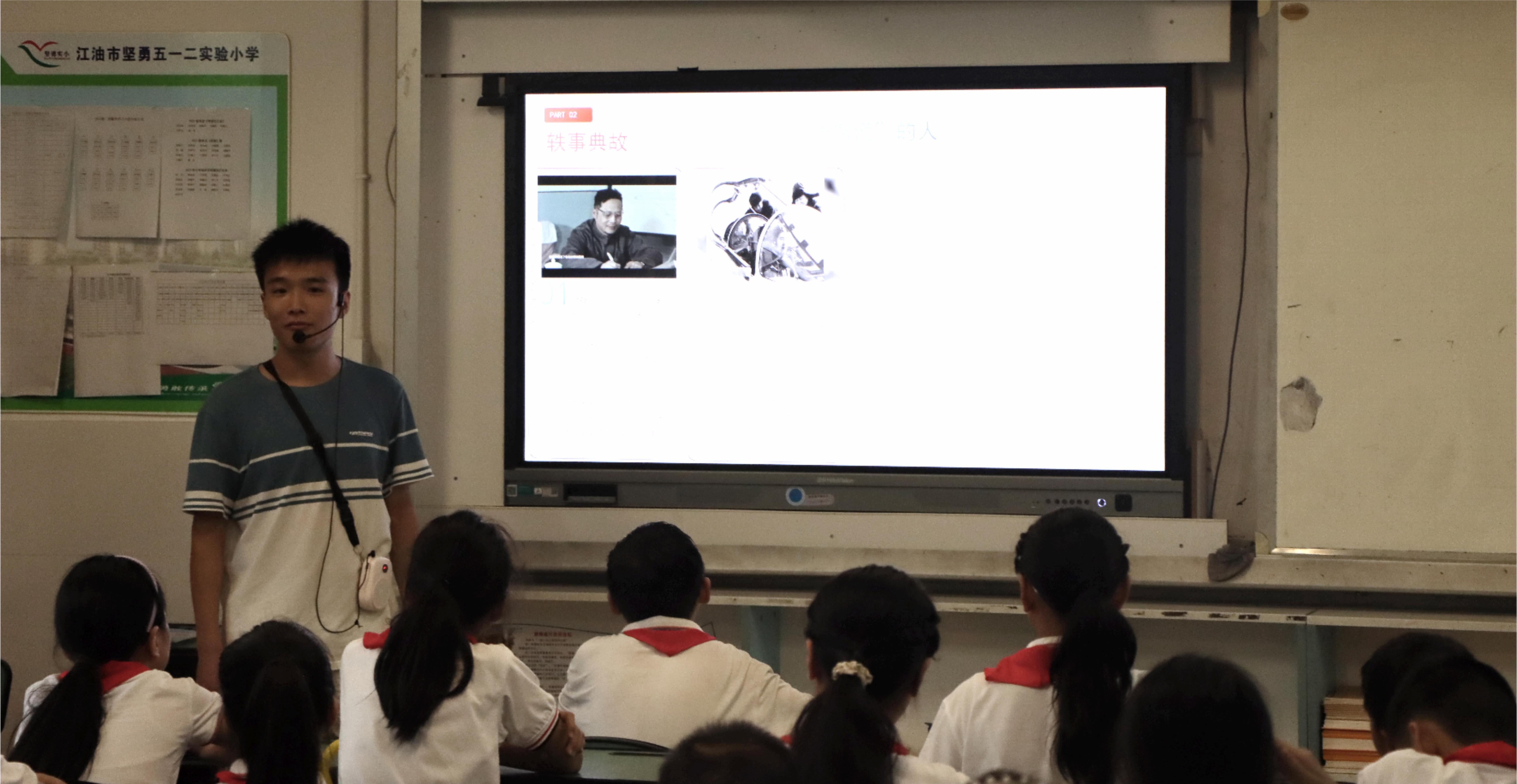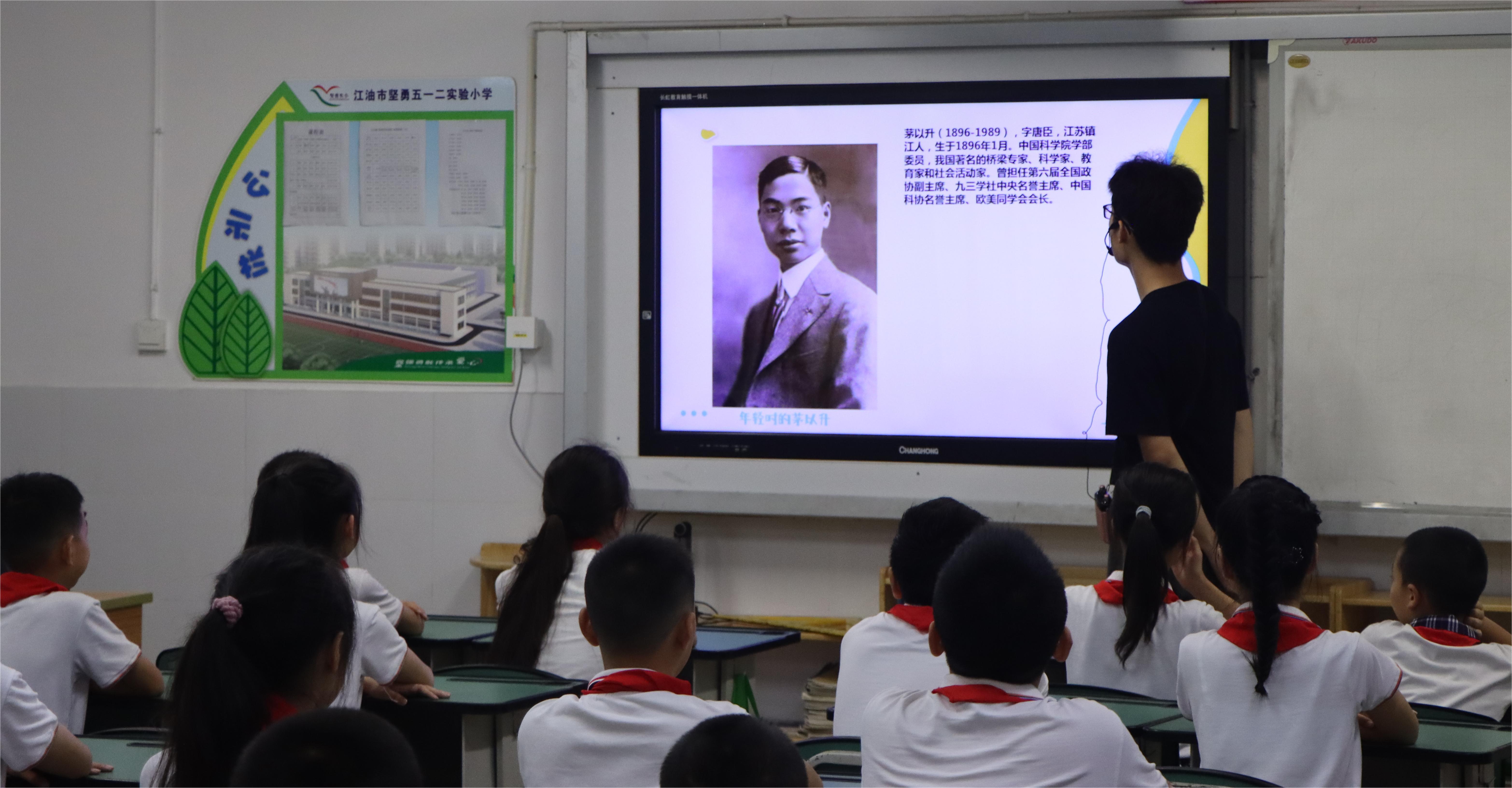 活动开始,实践队成员带领坚勇实小的孩子们学唱歌曲《最美的光》和《中国科学家》,孩子们悦耳的歌声回荡在教室的每个角落。据悉,这两首歌曲均由坚勇实小名誉校长陈永庆先生发起创作,以婉转动听的旋律和朗朗上口的歌词让科学家精神流入听众的心中。