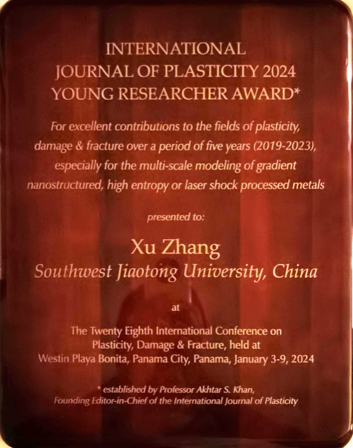 张旭教授因在梯度结构材料、高熵合金和激光冲击强化材料的多尺度模拟相关领域的杰出贡献(multi-scale modeling of gradient nanostructured, high entropy or laser shock processed metals)获第19届IJP青年学术奖。