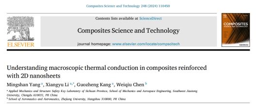 近日,西南交通大学李翔宇教授课题组在二维纳米片增强复合材料的宏观导热性能研究方面取得进展,相关成果以“Understanding macroscopic thermal conduction in composites reinforced with 2D nanosheets”为题发表在国际复合材料领域的顶级期刊《Composites Science and Technology》(中科院一区TOP,IF:9.1)。博士研究生杨名山为第一作者,李翔宇教授为通讯作者,合作作者包括西南交通大学康国政教授和浙江大学陈伟球教授。