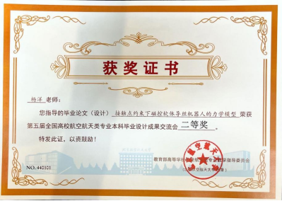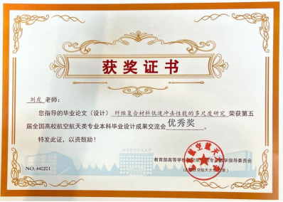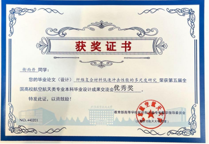 本次会议,吸引来自北京航空航天大学、哈尔滨工业大学、北京理工大学、西北工业大学、南京航空航天大学、国防科技大学、电子科技大学、四川大学、西南交通大学、海军航空大学、火箭军工程大学等20余所高校,300余名学生参赛。经过汇报人毕业成果汇报、现场演示、专家评议等环节,我院2020级飞行器设计与工程专业本科生谭丽丹的毕业论文“接触点约束下磁控软体导丝机器人的力学模型”(指导教师:杨洋 王柳)荣获二等奖,2020级飞行器设计与工程专业本科生衡雨丹的毕业论文“纤维复合材料低速冲击性能的多尺度研究”(指导教师:刘虎)荣获优秀奖。这是我们院首次获得全国高校航空航天类专业本科毕业设计成果交流会二等奖。