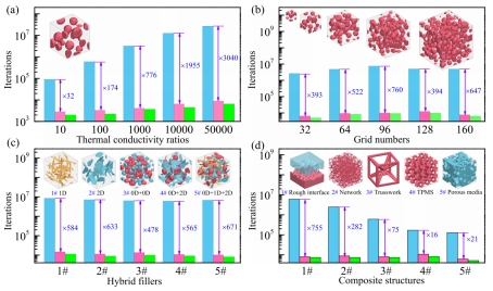 本研究工作发展了一种高效预测复合材料等效热导率的新数值算法,使大网格数、高热导率比的三维复杂结构的高通量模拟成为了可能,为复合材料热性质的数据驱动研究提供了有力支撑。