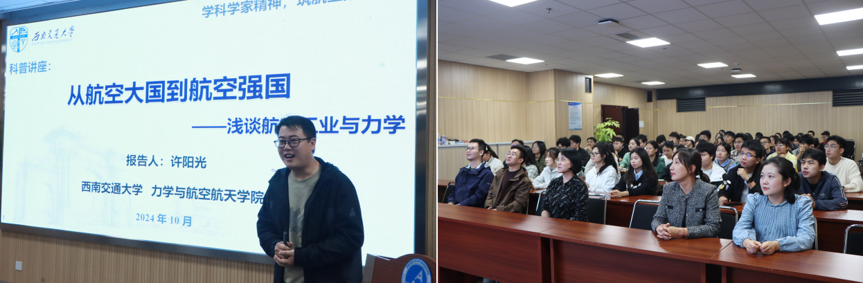 特别邀请许阳光副教授在学院X30224学术厅开展“从航空大国到航空强国”主题讲座。许老师从自古以来人们的“飞天”憧憬、古代的“飞行器”讲到现代的飞行器,探讨中国从航空大国向航空强国转变的历程。他详细讲解了科技创新在这一过程中的关键作用,并分享了多个实际案例。让师生们对航空科技有了更深入的了解,同时学习老一辈科学家、航天人以及忠诚担当、践行科学报国之志的爱国精神。