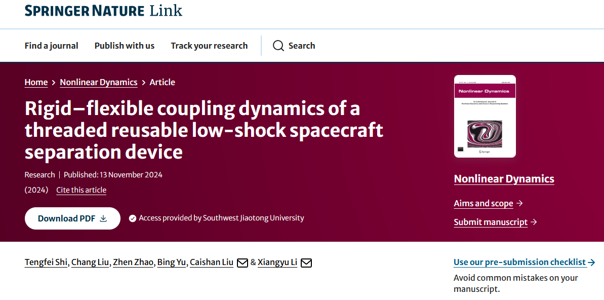近日,西南交通大学李翔宇教授课题组在航天器机构动力学方面取得进展,相关成果以“Rigid-flexible coupling dynamics of a threaded reusable low-shock spacecraft separation device”为题发表在动力学领域期刊《Nonlinear Dynamics》。西南交通大学石腾飞博士后为第一作者,西南交通大学李翔宇教授和北京大学刘才山教授为共同通讯作者,合作作者包括西南交通大学刘畅讲师、北京航空航天大学赵振教授,以及中国运载火箭技术研究院余兵高级工程师。论文详细信息见图1,论文链接://link.springer.com/article/10.1007/s11071-024-10591-1