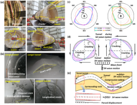 为了验证理论模型的正确性,研究团队利用振动台试验模拟地震波作用,通过缩尺模型的环向应变数据与理论计算结果进行对比,验证了模型精度(图2c)。振动台试验验证了理论模型的准确性,不仅证实了拱肩和拱脚的应变集中现象,还指出了地震作用下洞口仰坡的滑塌和衬砌变形的真实破坏模式(图3),为隧道口抗震设计提供了直观依据。此外,研究团队还将本研究与雅典国家技术大学Kouretzis教授等人的研究进行对比。研究计算结果与其接近。不同之处在于,Kouretzis教授等人假设地层位移直接作用在隧道上,而本研究考虑了隧道与围岩的相互作用,使结果更符合实际,避免了高估隧道洞口响应的问题(图2d)。