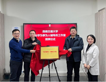 党委书记栗民、副书记孔祥彬共同为西南交通大学“为学为事为人”辅导员工作室揭牌并合影留念。