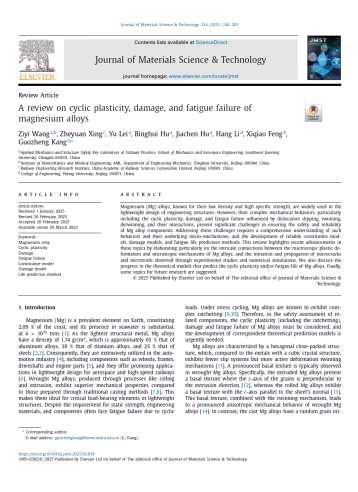 在“双碳”目标驱动下,轻量化材料成为工程结构减重增效的核心需求。镁合金作为最轻的金属结构材料,在汽车、航空航天等领域展现出巨大应用潜力。然而,其密排六方结构导致的复杂循环塑性行为与疲劳失效机制,成为制约其安全应用的关键瓶颈。近日,西南交通大学康国政教授团队在国际知名期刊《Journal of Materials Science & Technology》发表题为 A review on cyclic plasticity, damage, and fatigue failure of magnesium alloys的综述论文,系统梳理了镁合金循环塑性、损伤演化及疲劳失效的前沿进展,推动镁合金从“可用”走向“可靠”。