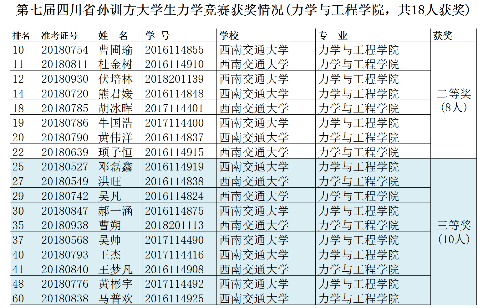 共同承办的第七届四川省孙训方大学生力学竞赛在我校犀浦校区2号教学楼举行。本项赛事每两年举办一次,经过赛前的周密部署和宣传,竞赛得到四川省内高校的积极响应,参加高校包括西南交通大学、四川大学、成都理工大学、西南石油大学、西华大学、西南科技大学、四川理工大学等20个单位。本届赛事首次将高职高专作为独立参赛群体单独命题进行竞赛,其中,本科及以上层次有14个院校参赛,共1370名参赛学生,创历史新高;高职高专有9个院校参赛,共184名学生参赛。西南交通大学组织安排了12个本科及以上层次考场、2个高职高专考场,四川大学江安校区安排了5个本科及以上层次考场。西南交通大学和四川大学参赛学生最多,分别为477名和367名。