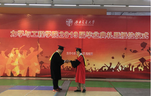 典礼开始,力学学院院长康国政教授发表致辞,真诚地祝贺2019届同学顺利毕业。在同学们即将踏上人生新的征途之际,康院长对同学们提出了以下几点期望:第一,希望各位同学认认真真做事、踏踏实实做人,延续 “严谨治学,严格要求”的双严传统;第二,希望同学们牢记“竢实扬华、自强不息” 的交大精神;第三,希望同学们常怀感恩之心,常回家看看。康院长希望同学们将个人前途发展与国家和学校发展相融合,积极投身于社会建设,在以后的人生道路上牢记交大精神,在新的领域里建功立业,为实现中华民族伟大复兴的中国梦而矢志奋斗,成为一个更加优秀的人。