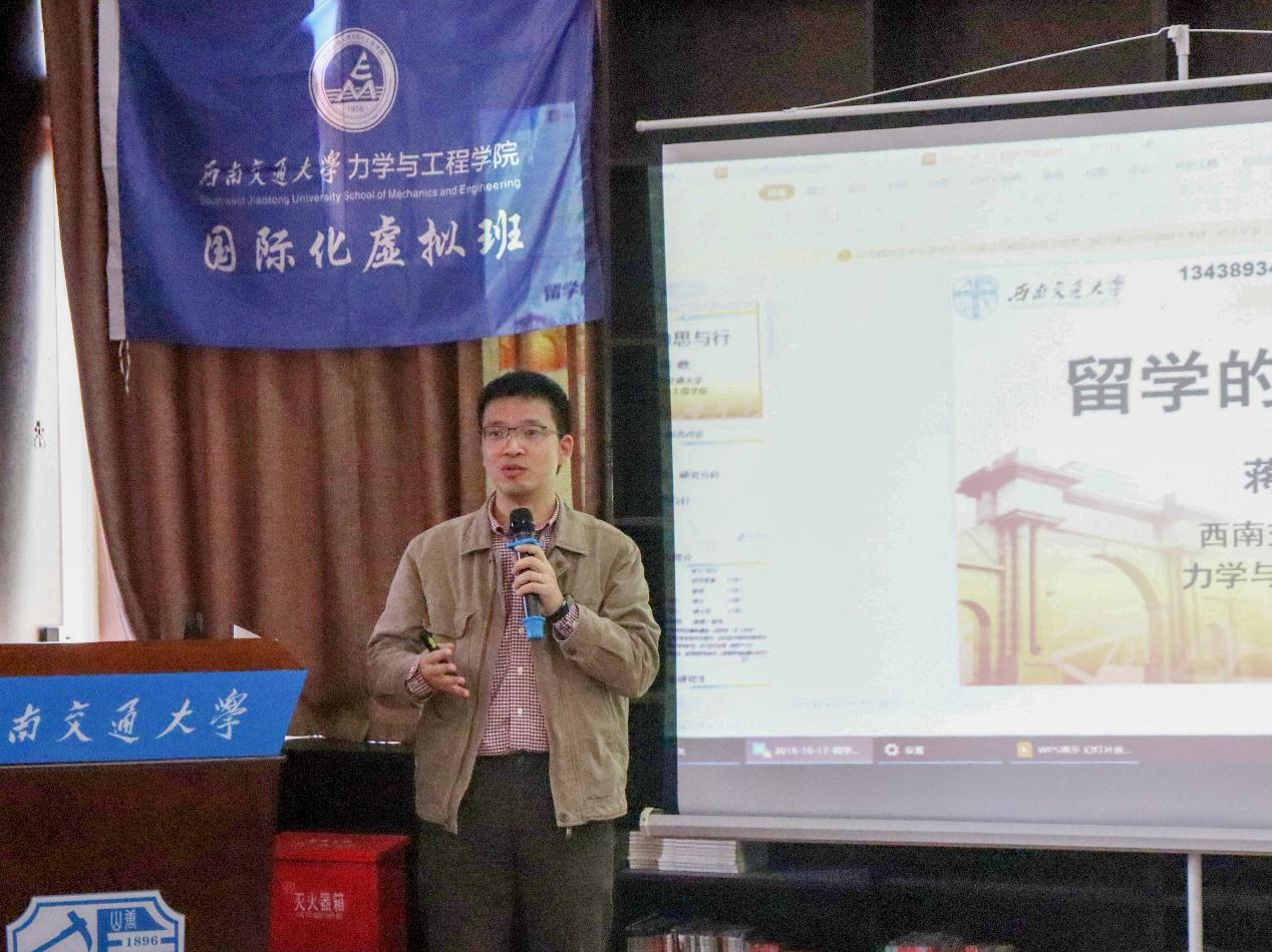 接着,蒋晗教授以“留学的思与行”为题进行留学分享,从个人留学经历及研究方向入题,以思辨学习中“what、how、why、what if”四问为主要框架,用幽默风趣的语言向同学们分享了自己对留学的感受和思考。他通过古今著名的留学事例向同学们解答了留学的定义,并介绍了留学的相关考试与资源,以此告诉同学们该从何处入手准备留学。蒋晗教授同时也鼓励同学们结合自身实际与需求,在留学的国家、院校、专业与导师之中做出自己的选择。