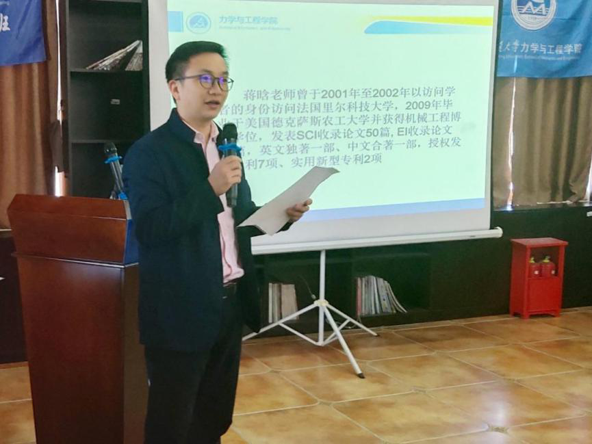 主持人首先致开场词,对莅临本次活动的领导和嘉宾表示热烈欢迎。随后,孔祥彬老师向到场同学们介绍了本次活动的主讲人蒋晗教授。蒋晗教授有着丰富的留学经历,2001年至2002年以访问学者的身份访问法国里尔科技大学,2009年毕业于美国德州农工大学获得机械工程博士学位,发表SCI收录论文五十余篇、EI收录论文八十三篇,授权发明专利7项、实用新型专利2项,有英文独著一部、中文合著一部。
