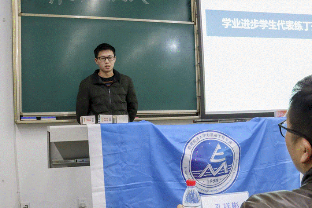 学业进步学生代表练丁开通同学发言,他向大家分享了自己的学习心得,讲述了自己是如何战胜学习难题,使自己一学期的课程全部通过。然后,党员先锋队代表王潇飞同学发言,他分享了自己的学习心得和帮助经历,希望学生党员们尽自己最大的努力取得优异成绩,发挥模范带头作用,同时他代表全体本科生党员表态承诺,真心诚意帮助努力班的所有同学,全心全意建设学院的良好学风。