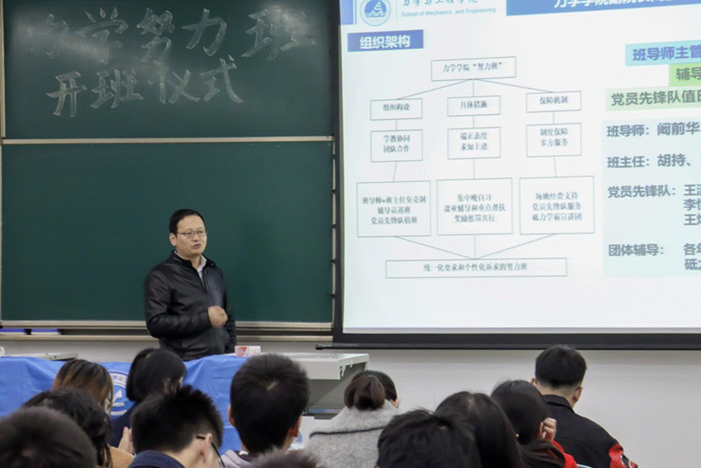 据悉,“努力班”是力学学院为传承“双严传统”、帮助学困生解决学习难题而建设的一个虚体班级,由学院副院长和副书记担任班导师,本科生党支部书记和教务员担任班主任。入班条件为“一学期未通过15个学分或挂科达到3门以上”。学院会组织班级同学每晚在固定教室自习,由本科党员先锋服务队负责值班签到及答疑,针对学习特别困难同学进行一对一帮扶,学院专业老师、辅导员老师、砥力学霸宣讲团将不定期开展学习交流、期末答疑、重点讲解等活动并提供保障帮助。学期内通过15个学分的同学即可出班,对成绩提升明显的同学授予“学业进步奖”。建设“努力班”,旨在融合推进力学学院双严学风行动和党员先锋力行动,为班级同学今后顺利深造或就业打下坚实基础。