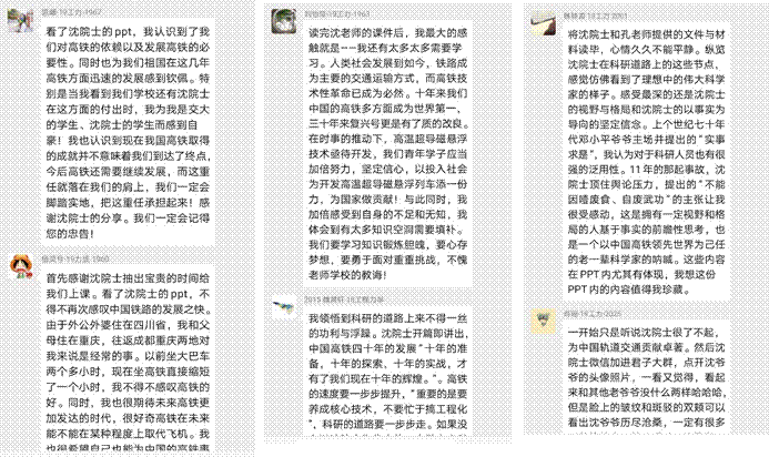 同学们纷纷表示听完沈院士的讲座,受益匪浅,对中国高铁的快速发展感到骄傲,同时,也了解到了轨道交通发展的重要性以及前途的广阔,未来会不断学习、充实自己,希望他日学成,能够在不同的领域贡献自己的一份力量。