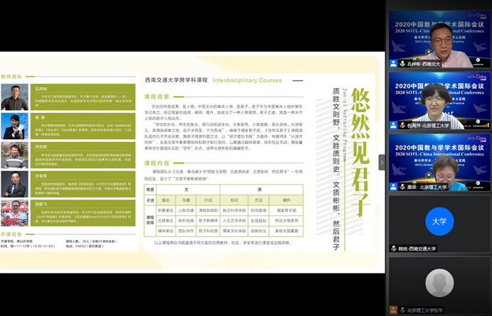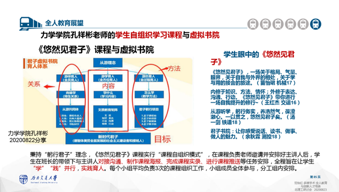 在第4分论坛,力学学院孔祥彬老师作为负责人主持召开了“多维学术、全人教育、学生自组织与团队共创式学习”研讨会。研讨会上,力学学院孔祥彬、人文学院朱洁、材料学院黄兴民、电气学院刘东分享了基于多维学术观和全人教育理念的以学生为中心的教育教学模式,探讨了教师引领下的学生自主学习自组织与团队共创式学习模式对学习共享空间建构和学习共同体形成的促进作用,江苏师范大学熊岚副教授进行了精彩点评。孔祥彬老师的发言题目为“通识课《悠然见君子》的共享空间打造与从游育人”。研讨会特别邀请了《悠然见君子》第七期班长、我院2018级力学工程专业杨静雷同学做专题研讨主持人。这种跨界组成的专题研讨方式和学生主持人的精彩发挥受到了与会老师们的一致赞誉。