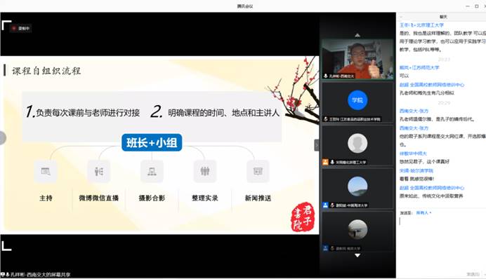 在国家级教学名师、南京大学桑新民教授主持的前置研修坊上,力学学院孔祥彬老师作为特邀嘉宾做了题为“君子虚拟书院的从游育人模式”的报告。君子虚拟书院是力学学院开展通识教育和课程思政的一个积极探索,它以通识课《悠然见君子》、新生研讨课《大学之道》、《大国动力》等课程为载体,将儒家从游育人方法与新时代“三全育人”理念融合,注重从知识、方法、情怀、表达、沟通、行动等“新君子六艺”来培养文质彬彬的新时代君子。与会老师们对这一教育探索表示出浓厚的兴趣,与孔祥彬老师进行了热烈的讨论。