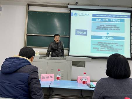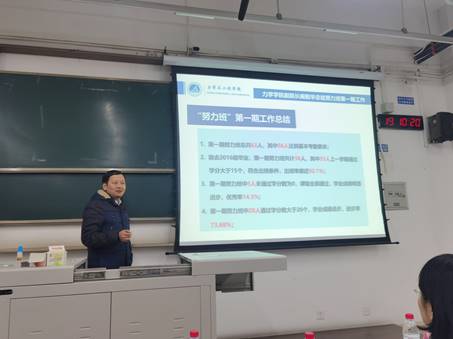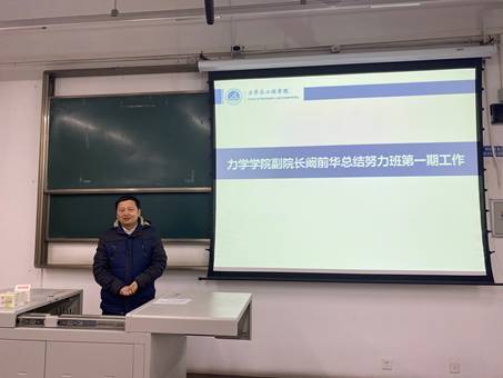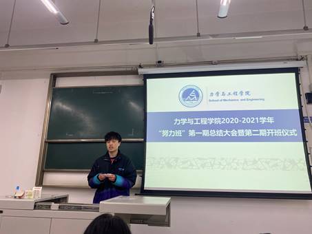 首先由力学学院副院长阚前华总结了努力班的第一期工作,介绍了党员先锋队值班和辅导员巡班的相关情况,高度肯定了砥砺学霸团的带头作用,对疫情期间筹办的努力讲坛给予积极的评价。阚院长提出了对努力班成员们要求与期望,希望同学们秉持“严谨治学、严格要求”的双严传统,相互监督,共同努力。阚院长指出努力班第一期的工作效果显著,告诫同学们贵在坚持,对自己要有信心,要有自我约束,并相信大家都能通过自己的不懈努力,未来早日“脱班”。