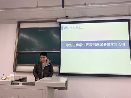 学业进步奖学生代表熊志诚同学分享了学习心得。他结合自身学习经历,强调应注重平时学习,按时上课,课后认真完成作业,保证每天都有较高的学习效率。他在自己的不懈努力下,成功战胜了学习难题,一学期的课程全部通过。