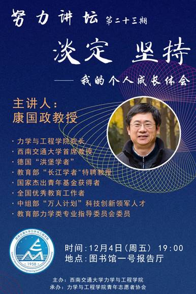 院长康国政教授在犀浦校区图书馆一号报告厅为同学们开展“淡定 坚持——个人成长体会”专题讲座。学院党委副书记孔祥彬,学生工作组辅导员周子涵、黄冠翔以及力学学院2020级新生参加了讲座,讲座由谭丽丹同学主持。