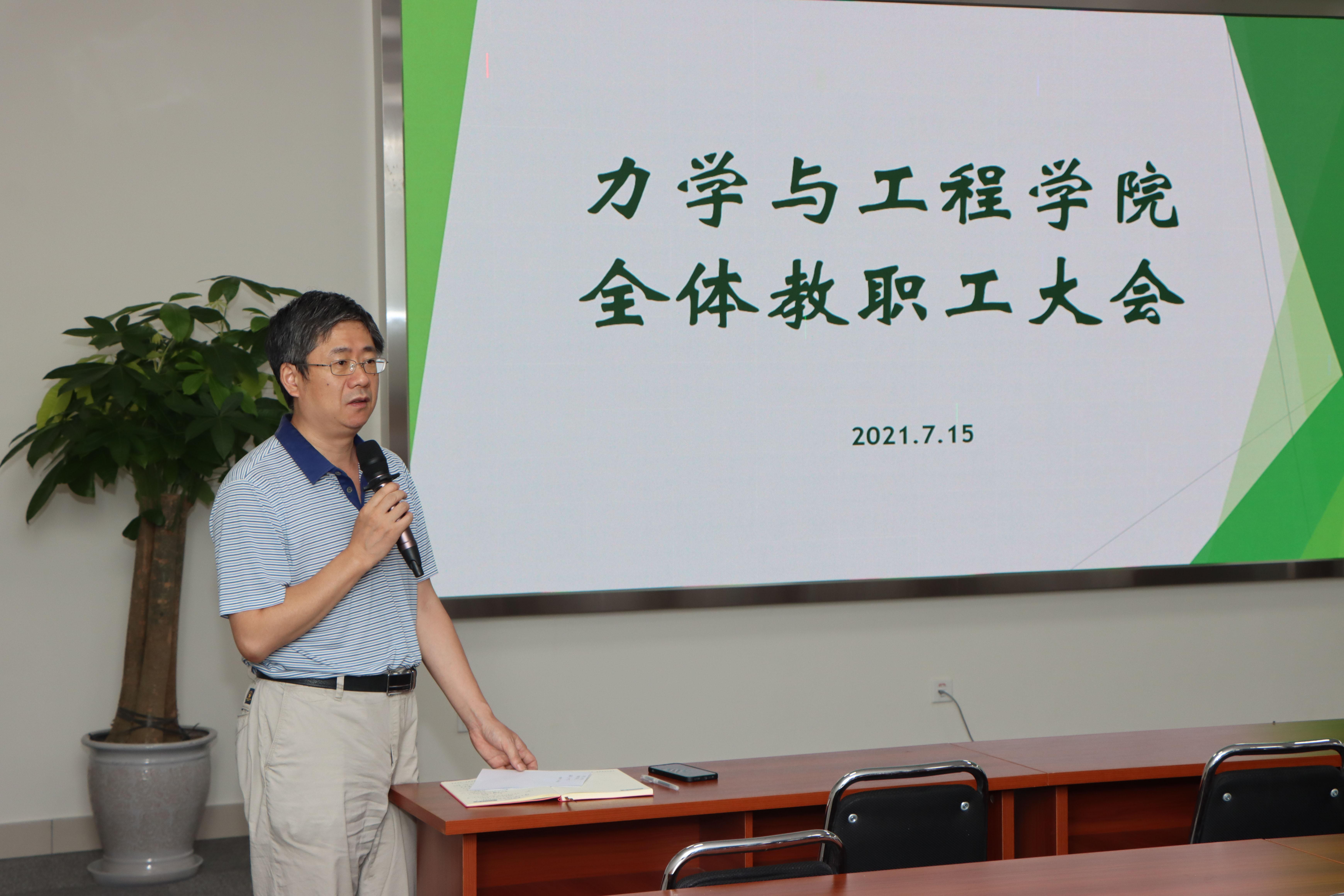 接下来,学院各分管领导进行了本学期工作成果通报和假期工作部署:受党委栗民书记委托,党委孔祥彬副书记向大会传达了中共中央、国务院印发了《关于新时代加强和改进思想政治工作的意见》文件精神,要求全体教职工要进一步加强思想政治教育工作,积极推进学院“三全育人”体系建设;随后,孔副书记与学院本年度上岗的18位博士生导师和41位硕士生导师进行了集体谈话,希望各位导师弘扬“严谨治学 严格要求”的“双严”传统,进一步提升对学生成长成才的全方位指导,特别要重视做好学生的理想信念教育工作,共同培养德智体美劳全面发展的力学领域拔尖创新人才;同时也以此促进学院学生的就业工作,保障学生的就业质量,孔祥彬老师通报了截止目前学院毕业生的就业情况,学生的就业率还需要进一步提升,希望各位老师积极提供就业单位和就业信息;高芳清副院长再次对学院教学、科研、学生实习、实验室和工作室等安全工作进行了具体要求,强调安全工作一刻也不能松懈;阚前华副院长通报了本学期本科和研究生教学工作,包括研究生培养方案修订、博士生助教、学生请销假等,要求导师要进一步加强对学生的论文要求和检查;李翔宇副院长通报了科研和国际办学工作成果,积极动员各位教师利用假期时间准备基金申报;办公室刘青主任通报了学校疫情防控、暑期工作安排和办公室工作室安全要求等工作。