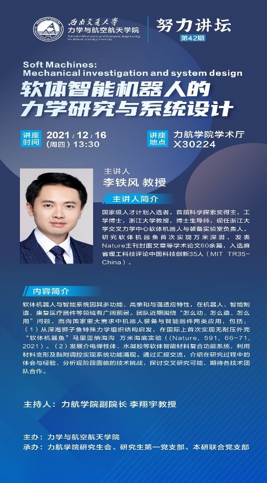 2021年12月16日下午,受康国政教授邀请,浙江大学李铁风教授做客我院“努力讲坛”第42期,讲授“软体智能机器人的力学研究与系统设计”。本次讲座由澳门六合彩开奖记录